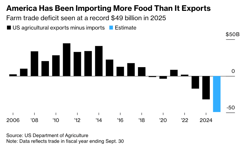 The U.S. is facing a record agricultural trade deficit, with imports of products like avocados, coffee, and sugar pushing the deficit to $49 billion this year, according to the U.S. Department of Agriculture. While U.S. agriculture once thrived as a global tool, it now imports more food than it exports, a trend that started in 2023. Prior deficits occurred only during Trump’s trade war and a few years before 1960.