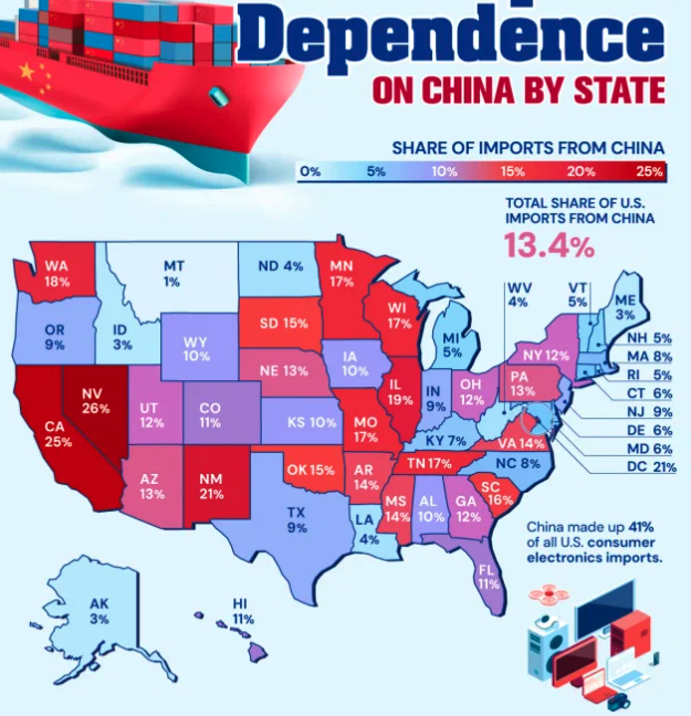 In 2024, the U.S. imported $438.9 billion worth of goods from China, accounting for 13.4% of all U.S. imports. Nevada had the highest reliance on Chinese imports, with 26% of its total imports coming from China, primarily driven by electrical machinery and parts. California, home to two of the country’s largest ports, imported $122.8 billion in goods, the highest among all states.