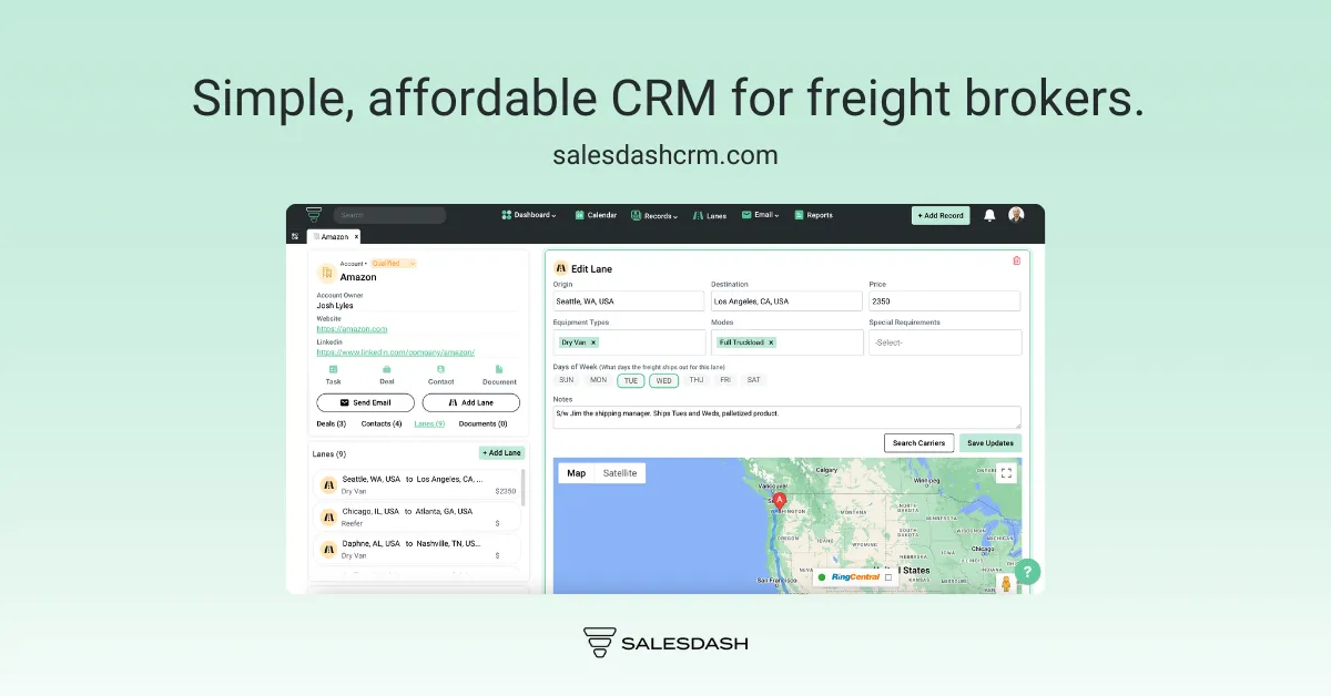 Salesdash CRM is built specifically for freight brokers & 3PLs. Organize your sales outreach, notes, follow-ups, and lane profiles for your shippers and carriers.