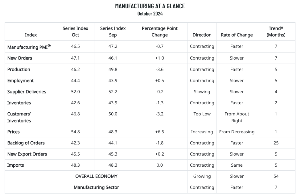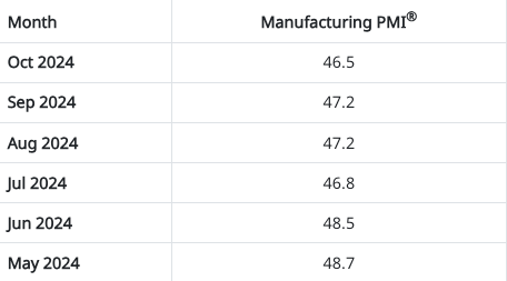 The report's benchmark reading, the Purchasing Managers' Index (PMI), dropped 0.7% to 46.5. A PMI reading above 50 indicates growth, making this the lowest figure for 2024. The PMI has contracted 23 times in the last 24 months, while the overall economy has expanded for 54 consecutive months since a contraction in April 2020.