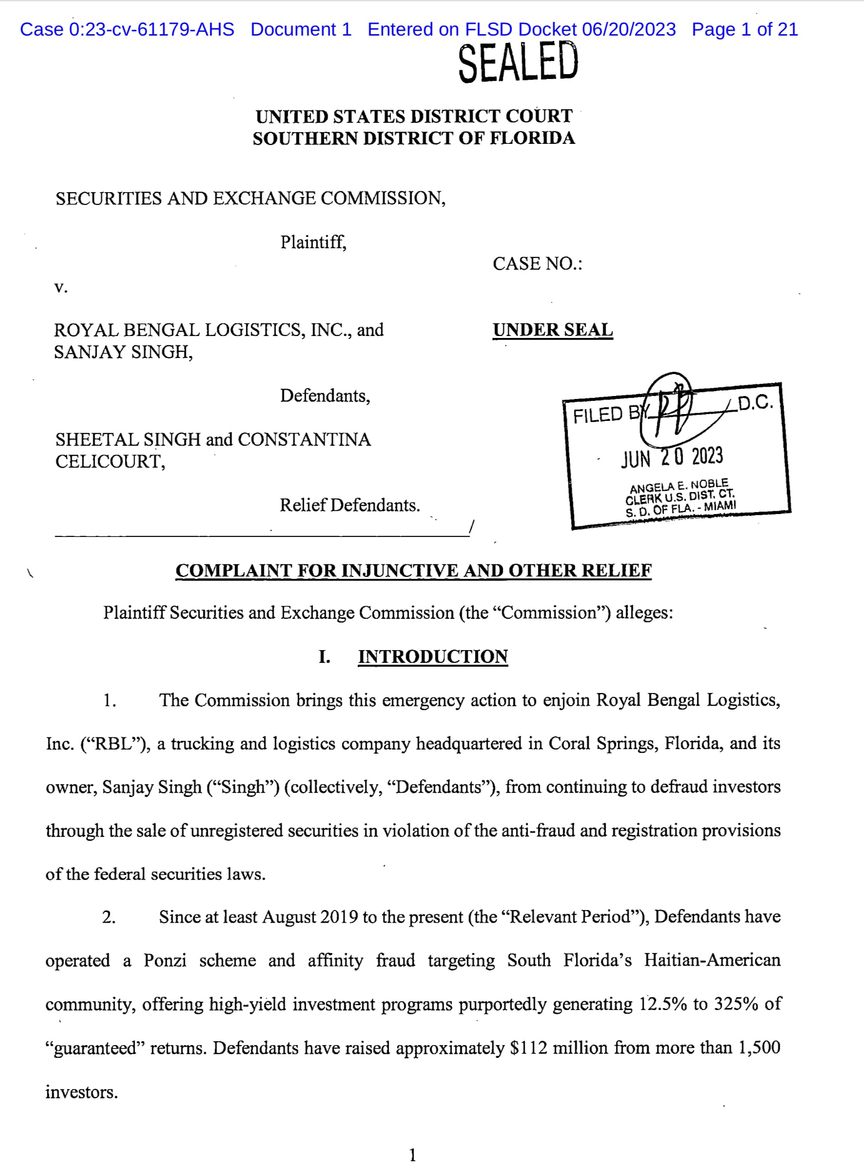 The SEC’s complaint alleges that from April 2021 to June 2023, Celicourt and Guillaume helped raise nearly $109 million from 1,500 investors, primarily Haitian-Americans, through an unregistered securities offering by Royal Bengal Logistics (RBL) of Coral Springs, Florida.
