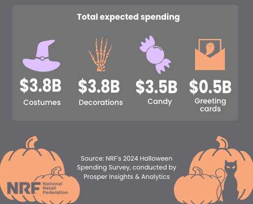 - Top Spending Categories: Total spending on candy is expected to reach $3.5 billion, while decorations and costumes are anticipated to hit $3.8 billion each.