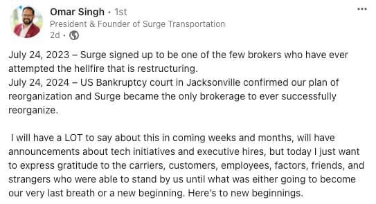 Remarkably, Surge Transportation emerged from bankruptcy after just one year, successfully completing its reorganization by July 24, 2024. This achievement marked a significant milestone for the company, as it became the first brokerage to ever successfully reorganize.