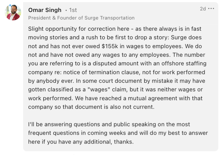 Prior to its emergence, rumors circulated regarding unpaid wages to employees. However, Surge's President and Founder, Omar Singh, publicly refuted these claims on LinkedIn.